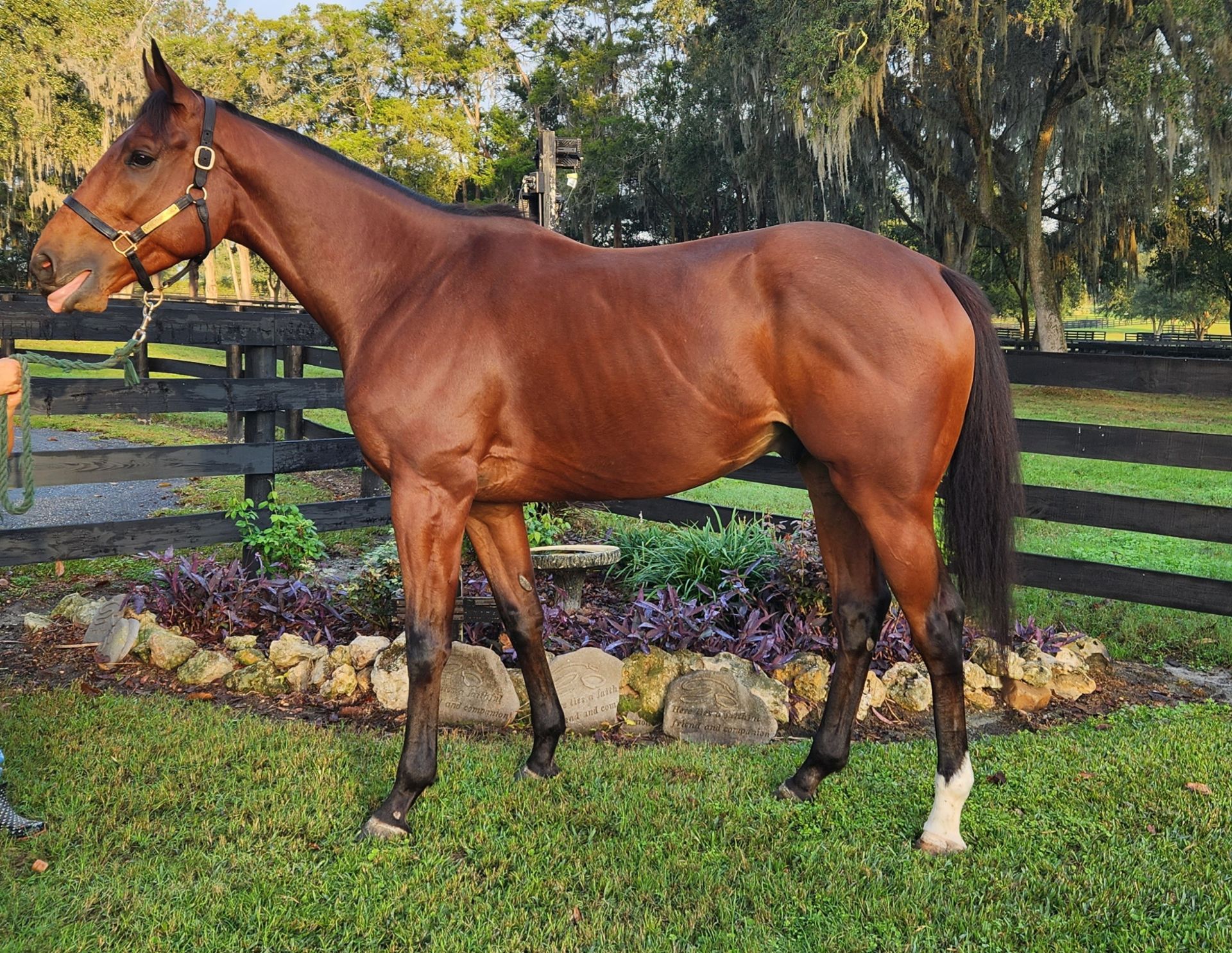 She lives with a treasured retired broodmare who is 24 and the old girls rule the roost at Huntingvale! They each have a stall with a fan for the extremely hot Florida days but much prefer to hang out side by side in their shady paddock! The girls are truly joined at the hips and give a new definition to the term Best Friends Forever!