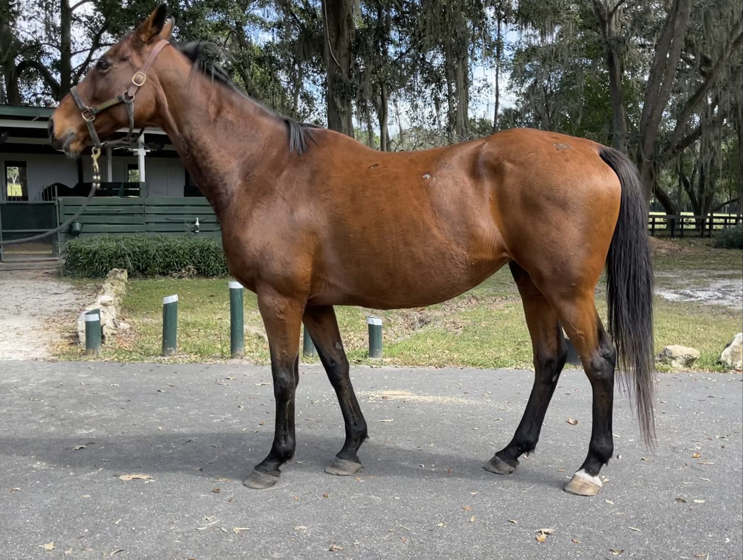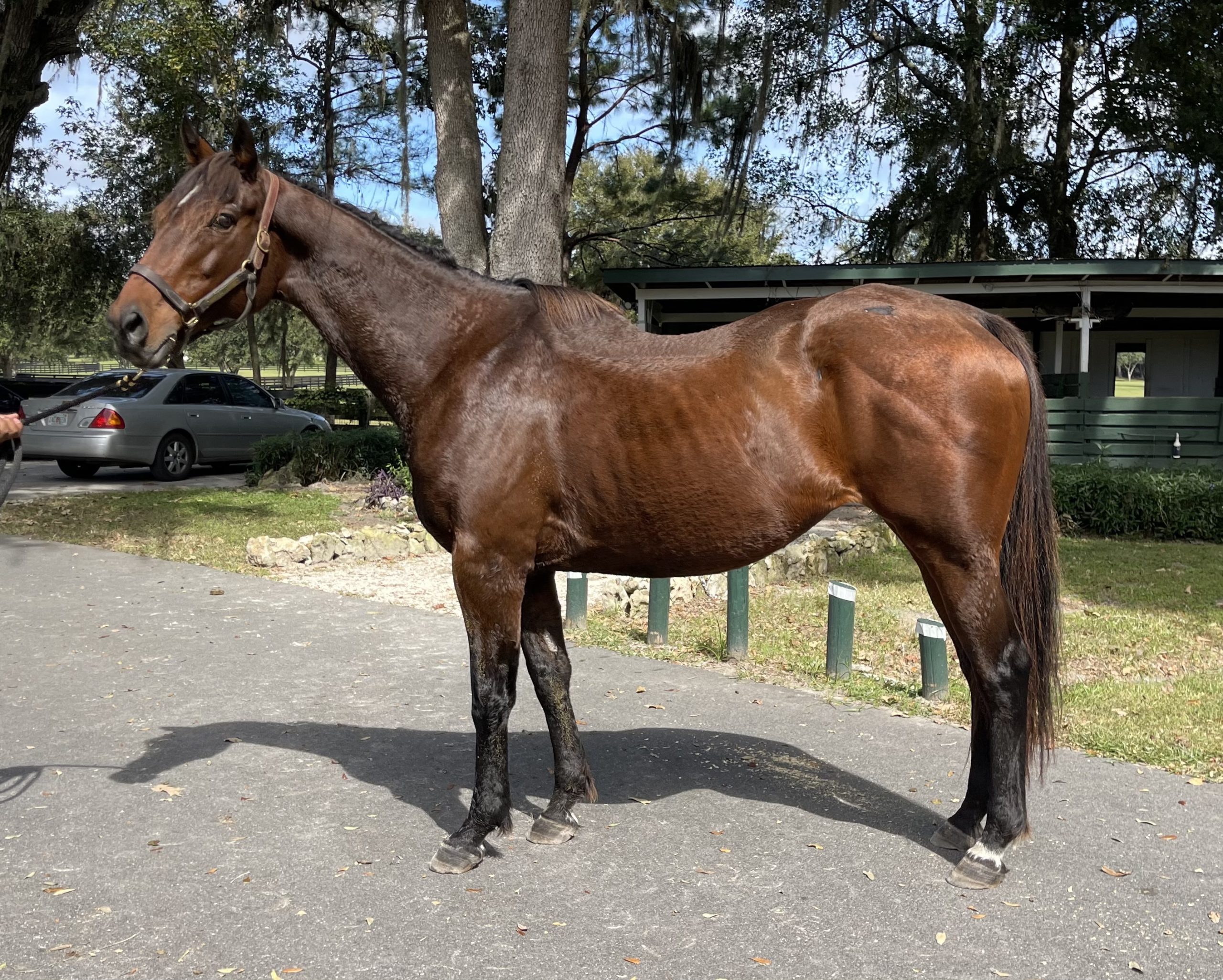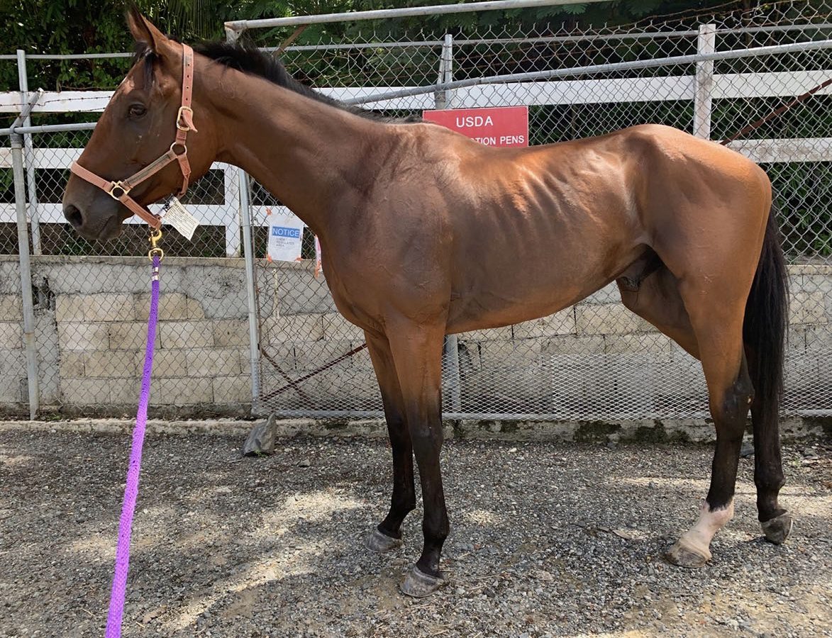 Miss Amelia was a 2011 NBS Program Graduate who raced in Minnesota and then went on to produce 4 foals. The last being registered in November of 2019. In August of 2020, we were notified by an individual that she had turned up at a feedlot in Eaton, CO. The individual wasn’t familiar with Thoroughbreds and lucky for us put the time and effort into finding Miss Amelia’s connections. We immediately bought her and were told that a horse her size and age should bring an average of $1,100 (meat price). Her condition was so poor that we paid $700! The stars lined up and we were able to quickly find her a ride. The terrified mare quietly loaded on the trailer and made her 48 hour trek to GA were she stayed for several days until shipping arrangements and paperwork was sorted for her last leg of the journey. A week after first hearing about her plight, Miss Amelia arrived at our farm. Her condition was beyond horrible, heartbreaking for all of us to see but rest assured, she is being well loved and slowly coming back. It is amazing she was able to make the long, hard journey but we are delighted with her spirit and tenacity.