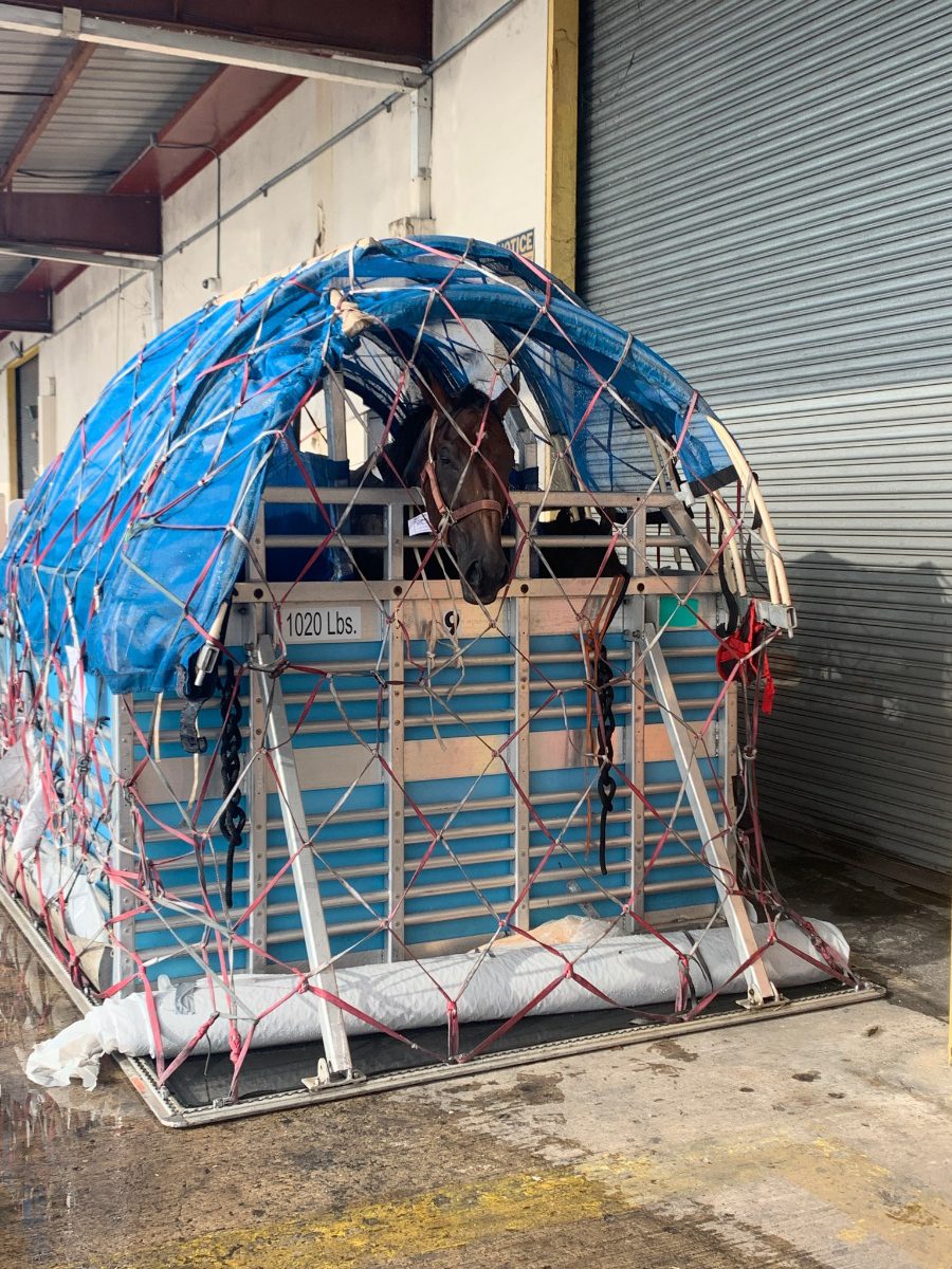 “Lucky’s” luck changed with a simple miscommunication! The van arrived once again to pick up Lucky even though he wasn’t ready to travel. But upon seeing Lucky the van driver was adamant she was picking up the horse. He was covered in open, infected wounds and had not received a veterinarian care. Needless to say, Lucky arrived in a sad state. Upon arrival, it took his groom over two hours to pick out the pieces of paper towel (which they used to cover his wounds) from his infected legs! As well, unbeknownst to us, Lucky also had a badly fractured knee.